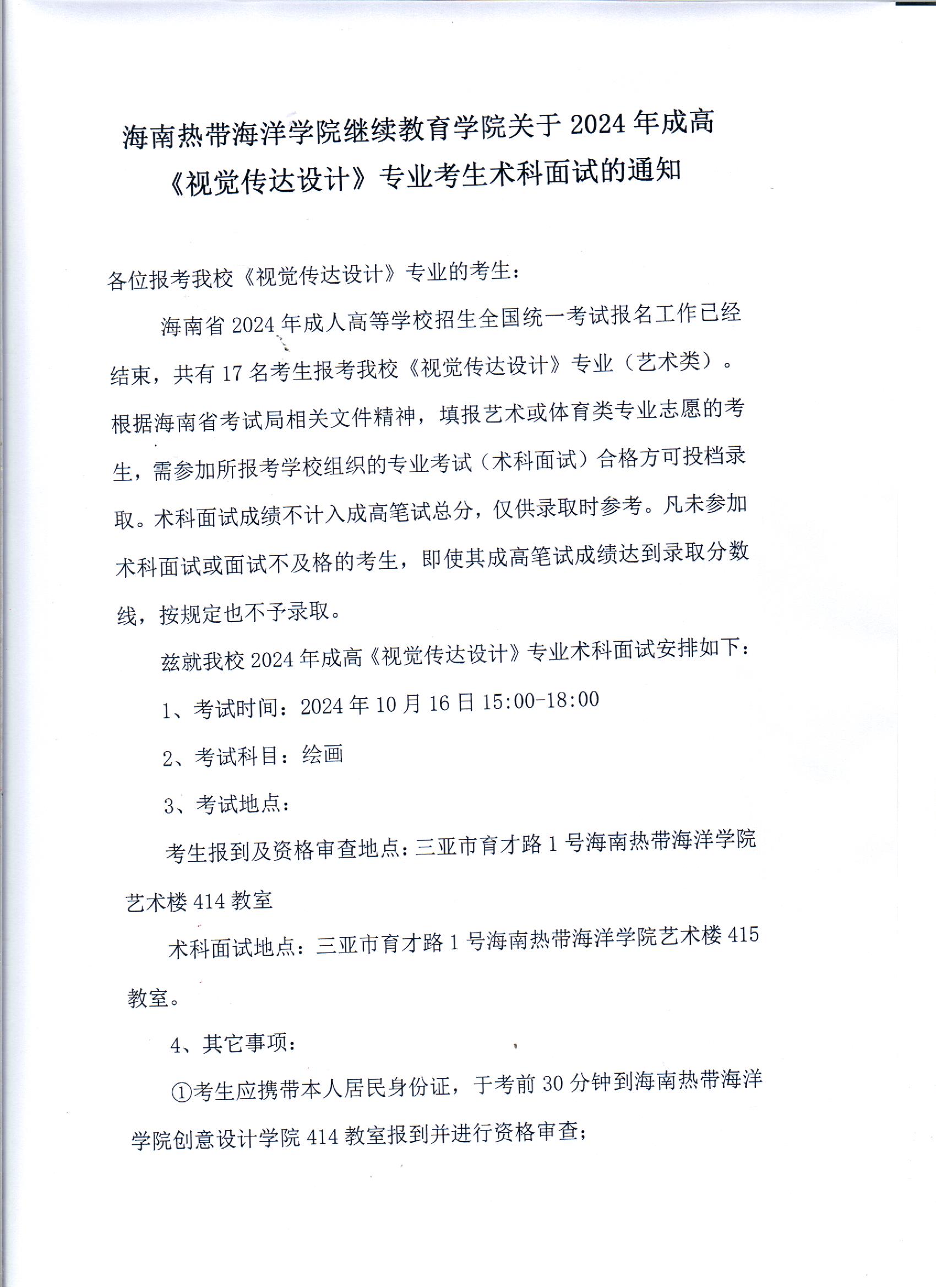 海南热带海洋学院继续教育学院关于2024年成高《视觉传达设计》专业考生术科面试的通知